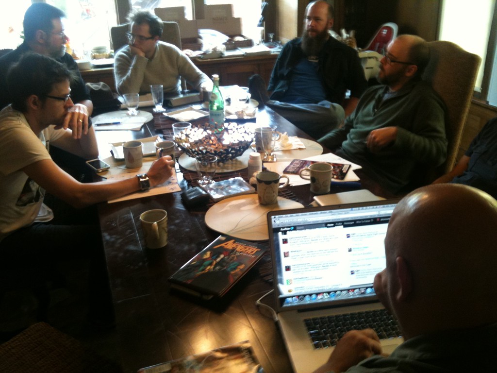 History in the making. All the main Marvel writers at Brian Michael Bendis’s house discussing the future storylines of Marvel Comics: Ed Brubaker, Matt Fraction, Brian Michael Bendis, Jonathan Hickman, and Jason Aaron.