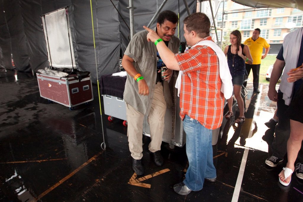 Neil deGrasse Tyson listening intently to Patton Oswalt
