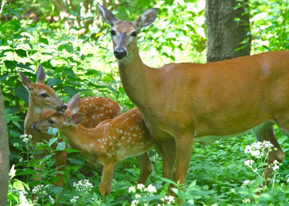 A doe and two fawns cool off in the wooded area of a Wilmette backyard.