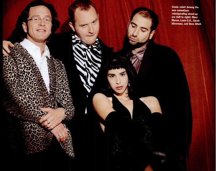 A picture of Marc Maron, Louis C. K., Sarah Silverman, and Dave Attell. This has to be early to mid 90’s because Louis C. K. and Dave Attell have hair.