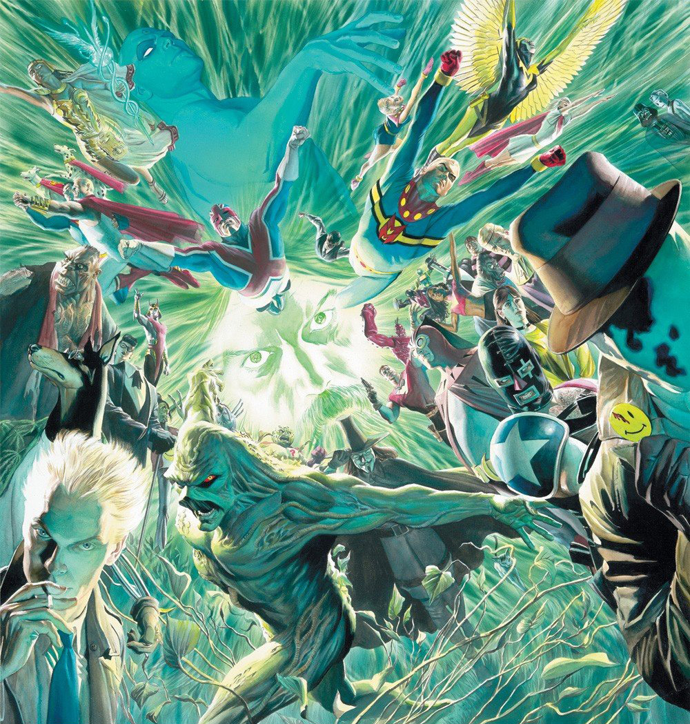 Alex Ross’s depiction of a galaxy of Alan Moore characters, illustrating an article in Wizard Magazine #130. Bits and pieces of this were reprinted in Mythology: The DC Art of Alex Ross, but the non-DC characters weren’t reprinted there. Just as with yesterday’s portrait by Brian Williamson, I’d love to have a print of this on my wall, but I’m not going to hold my breath that anyone could get the rights together to do so.