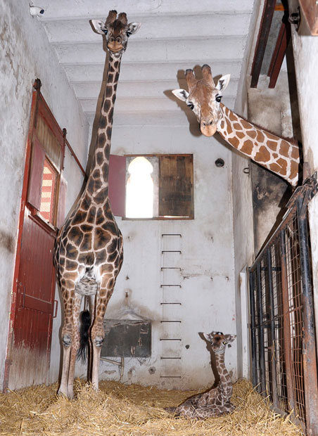 A one-day old giraffe calf and its parents Jacky and Budy are seen in their enclosure at the Buenos Aires Zoo
