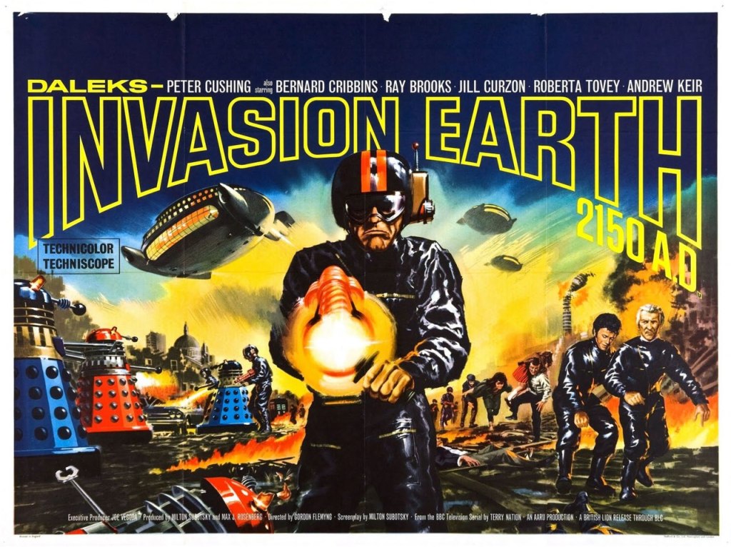 The poster for Daleks Invasion of Earth 2150 A.D. movie starring Peter Cushing as Dr. (Not Doctor) Who!
