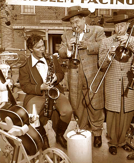 Laurel and Hardy swing out with Orson Welles and his hot sax. Orson’s between scenes for Jane Eyre (1944), and The Boys are shooting Jitterbugs (1943) elsewhere on the Twentieth Century-Fox lot.
